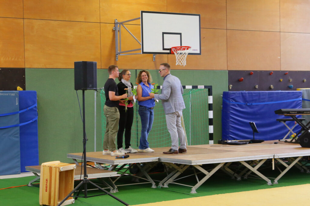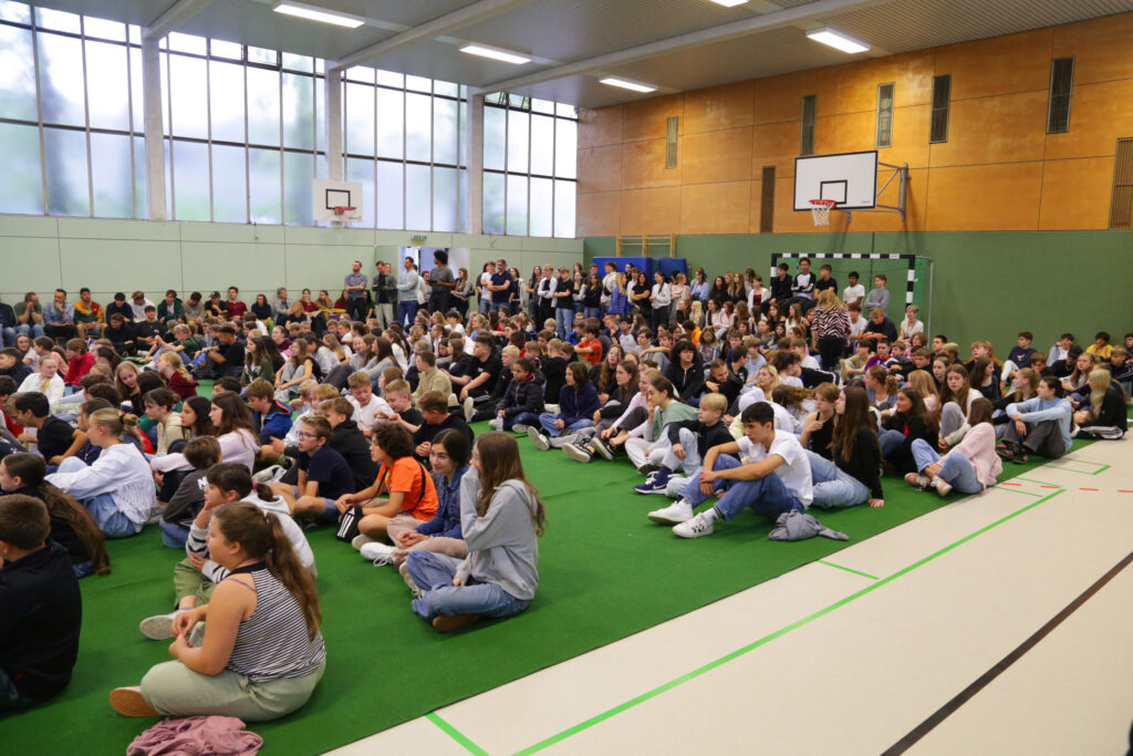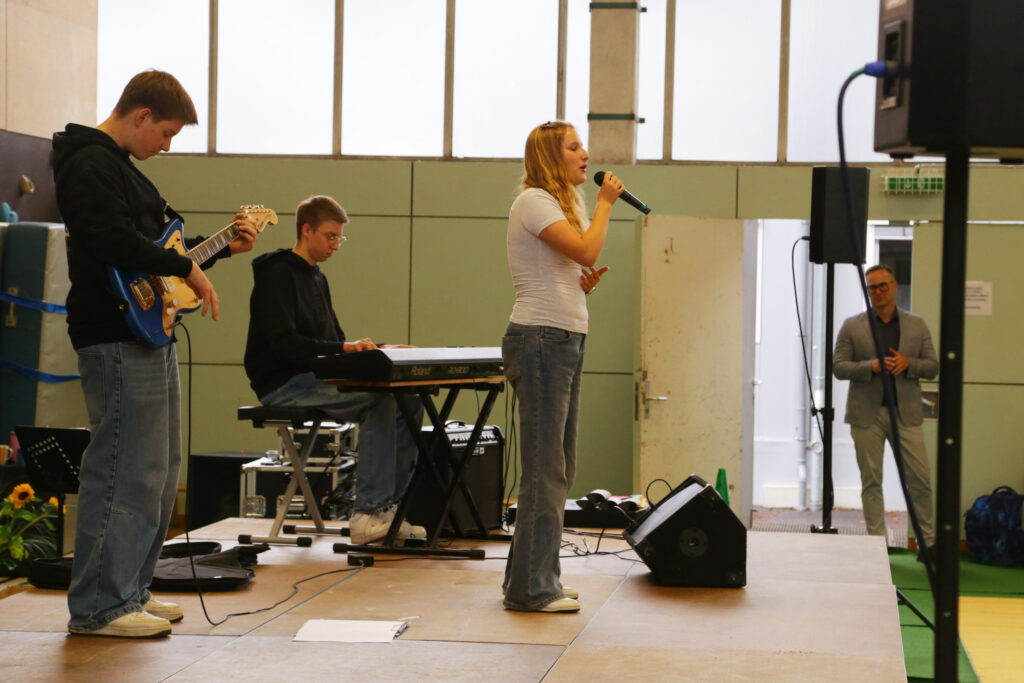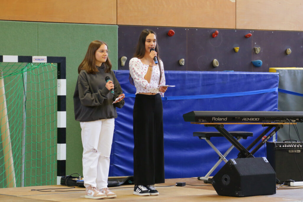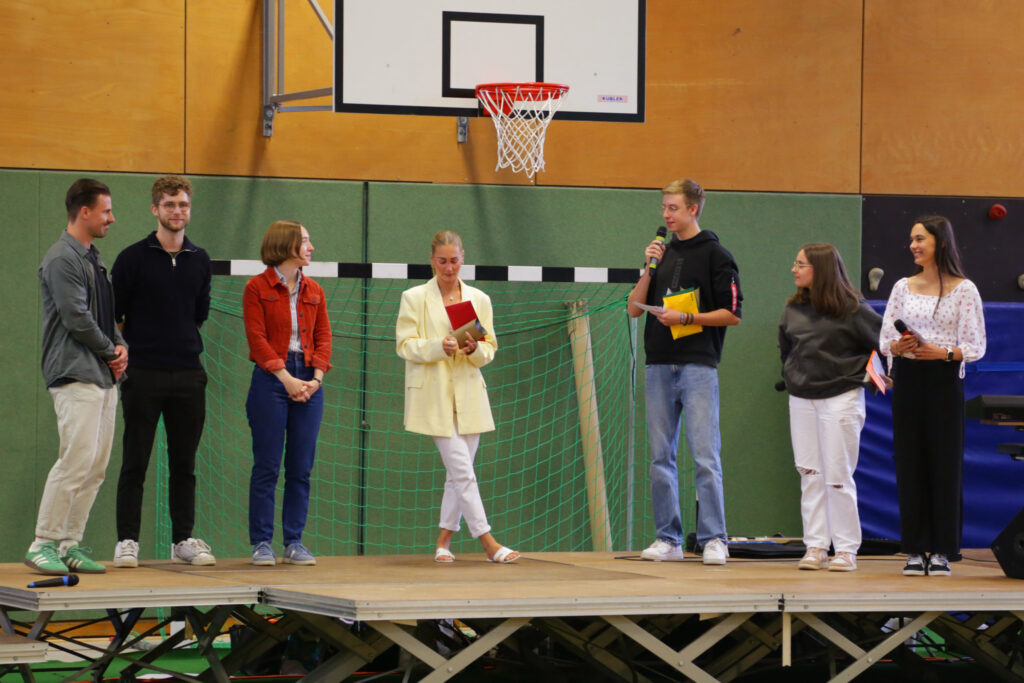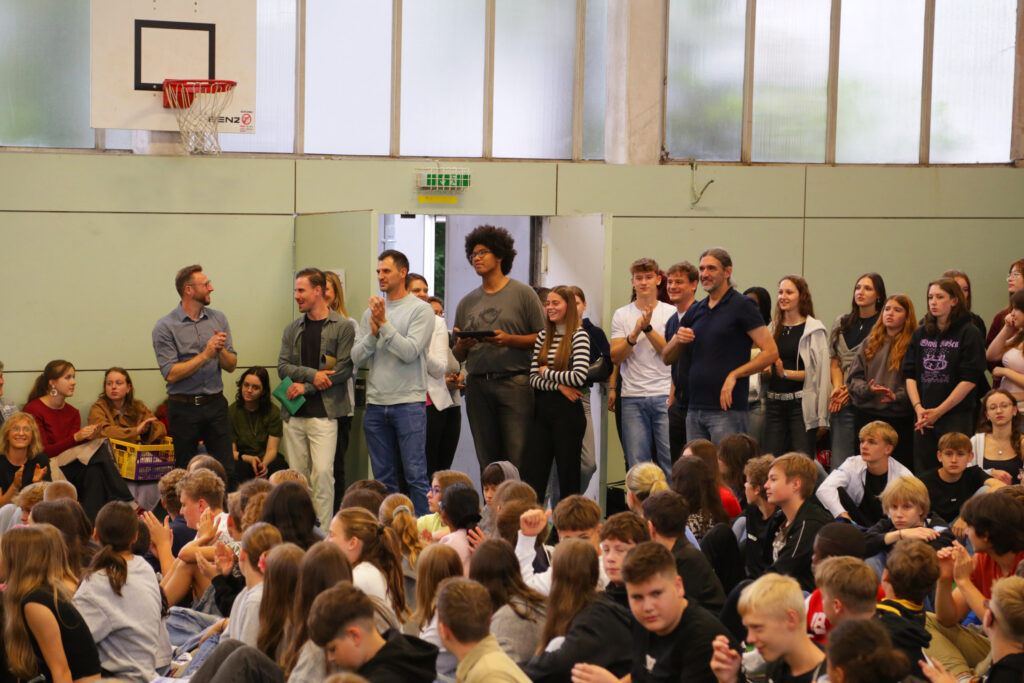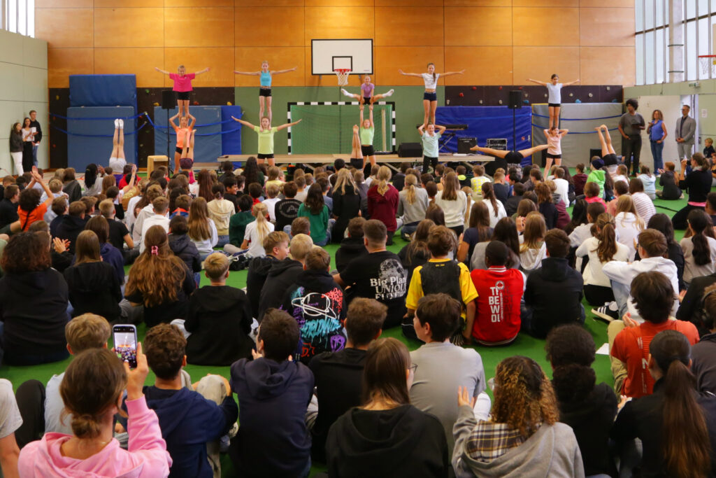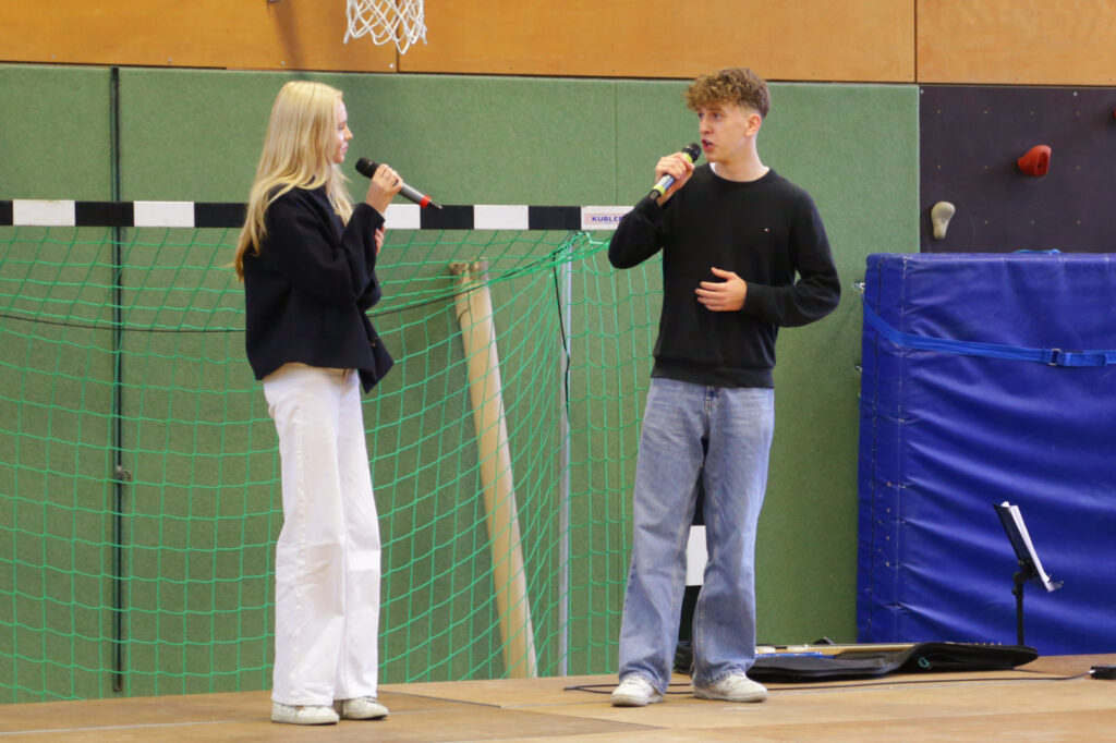 Den Auftakt machte die neu formierte Schülerband um Nela, Niklas und Laurin, die mit dem Coldplay-Klassiker Viva La Vida für gute Stimmung sorgte. Anschließend begrüßten die Moderatorinnen Lina und Aaliyah das Publikum und führten mit Charme und Professionalität durch das vielfältige Programm. Ein Höhepunkt folgte dem nächsten: Die Akrobatik-AG präsentierte ihre eindrucksvollen Choreografien, die das Publikum begeisterten. Im Anschluss wurden Schülerinnen und Schüler geehrt, die im Laufe des Schuljahres besondere Leistungen bei Wettbewerben erzielt hatten – ein Zeichen für das große Engagement und Talent unserer Schülerschaft. Ein besonderer musikalischer Moment war der Auftritt von Amelie aus Klasse 10, die mit ihrem selbstgeschriebenen Song „Kurz mutig sein“ gleich zwei bedeutende Preise gewann: einen Bundespreis beim Europäischen Wettbewerb sowie einen ersten Preis des Landtags Baden-Württemberg. Mit mitreißender Energie zeigte die Tanz-AG im Anschluss, wie vielfältig und ausdrucksstark Bewegung sein kann. Den krönenden Abschluss des Showteils bildeten die Sportakrobatinnen, die mit spektakulären Hebefiguren und beeindruckender Körperbeherrschung das Publikum in Staunen versetzten. Zum Ende des Festakts wurden vier Lehrkräfte, Frau Crone, Herr Mundt sowie die beiden Referendare Frau Schmid und Herr Arndt, in neue berufliche Wege verabschiedet – ein emotionaler Moment voller Dankbarkeit und Wertschätzung. Musikalisch ausklingen ließ die Schulgemeinschaft das Fest mit einem gefühlvollen Duett: Amelie und Lukas begeisterten mit A Million Dreams das Publikum und gaben der Assembly einen würdigen Schlusspunkt.