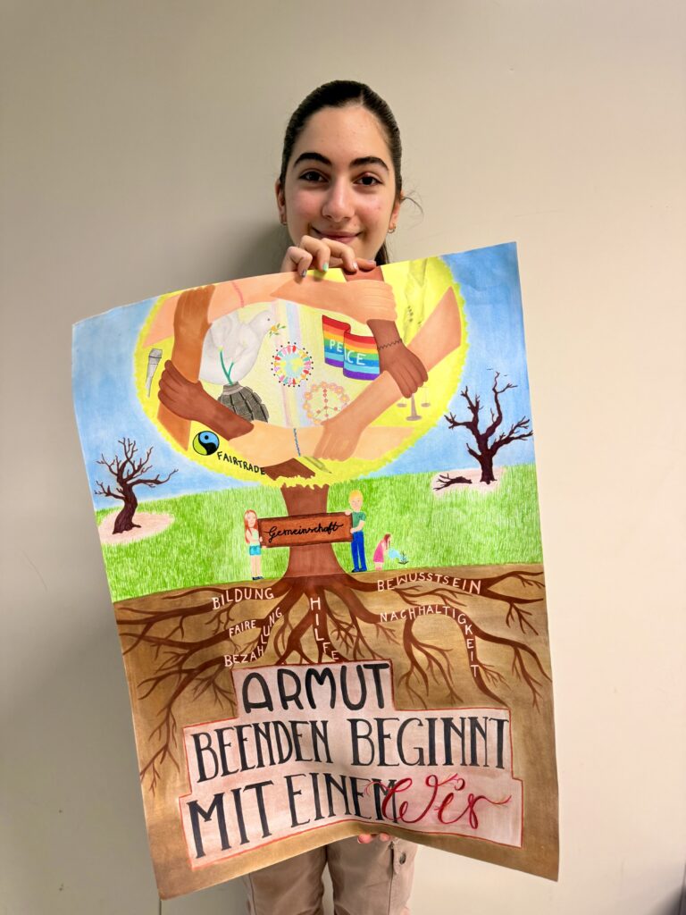 Maria Bar Schabo (Klasse 7b) erreichte mit ihrem Plakat zum Thema „Kampf gegen Armut“ einen 3. Preis. Ebenfalls einen 3. Preis erhielt Marie Barinc (Klasse 9c) für ihr eindrucksvolles Bild zu diesem wichtigen Thema. Aleksandra Temper (Klasse 10b) konnte die Jury besonders überzeugen und wurde mit einem 2. Preis ausgezeichnet. Alle drei Arbeiten zeichnen sich durch klare Botschaften, kreative Gestaltung und ein starkes gesellschaftliches Engagement aus.
