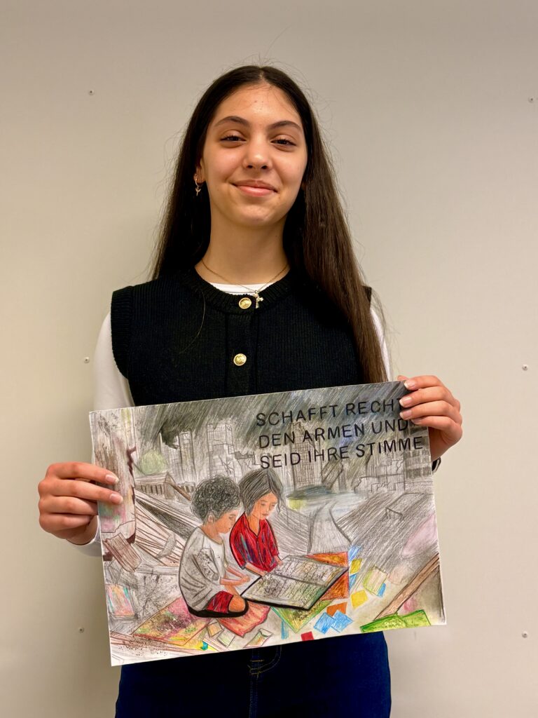Gerade das Thema soziale Gerechtigkeit und der Kampf gegen Armut zeigt, wie wichtig es ist, früh ein Bewusstsein für gesellschaftliche Herausforderungen zu entwickeln. Umso erfreulicher ist es, dass unsere Schülerinnen mit ihren Arbeiten nicht nur künstlerisch überzeugen konnten, sondern auch ein starkes Zeichen für Solidarität setzen.